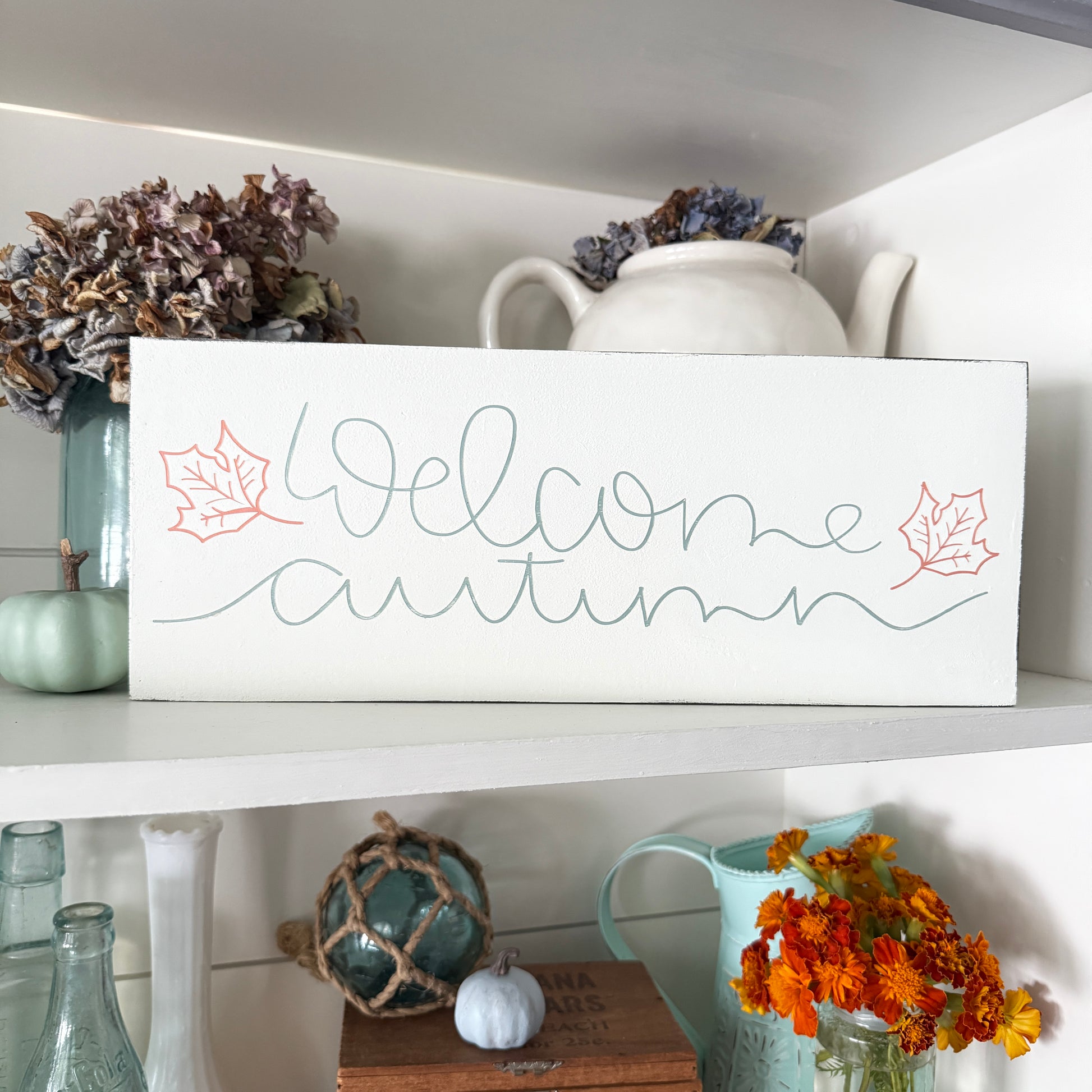 Welcome Autumn with leaves in aqua and pale orange